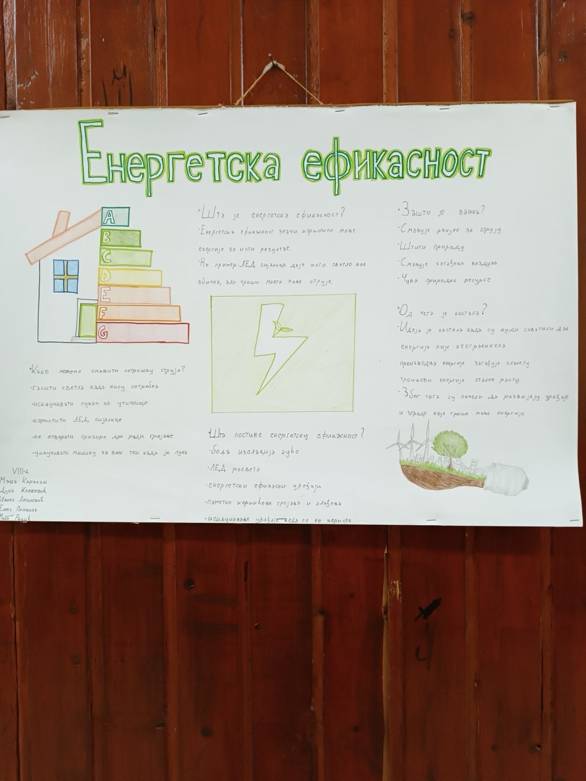 Светски дан енергетске ефикасности. Обележава се 5. марта. Овај дан нас подсећа на важност смањења потрошње енергије и о примене обновљивих ресурса. Ученици VIII/1 и VIII/2 разреда су на часу технике и технологије овај дан искористили за размену информација о различитим начинима коришћења енергије и како се може постићи енергетска ефикасност у свакодневном животу. Аутор: Јелена Марцикић