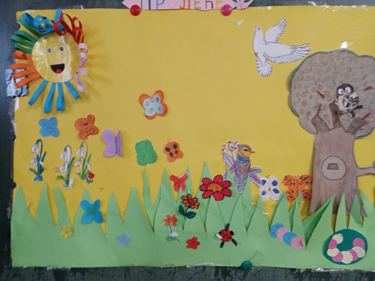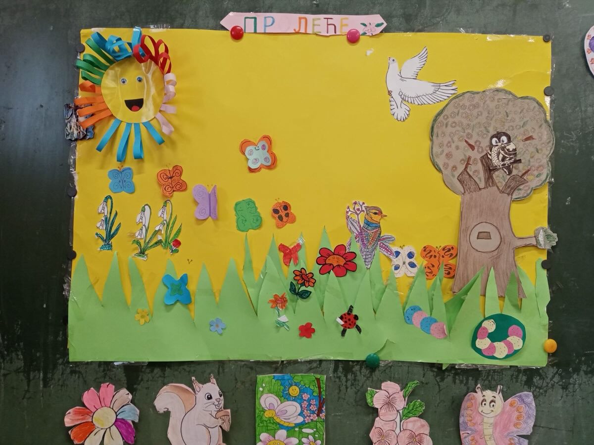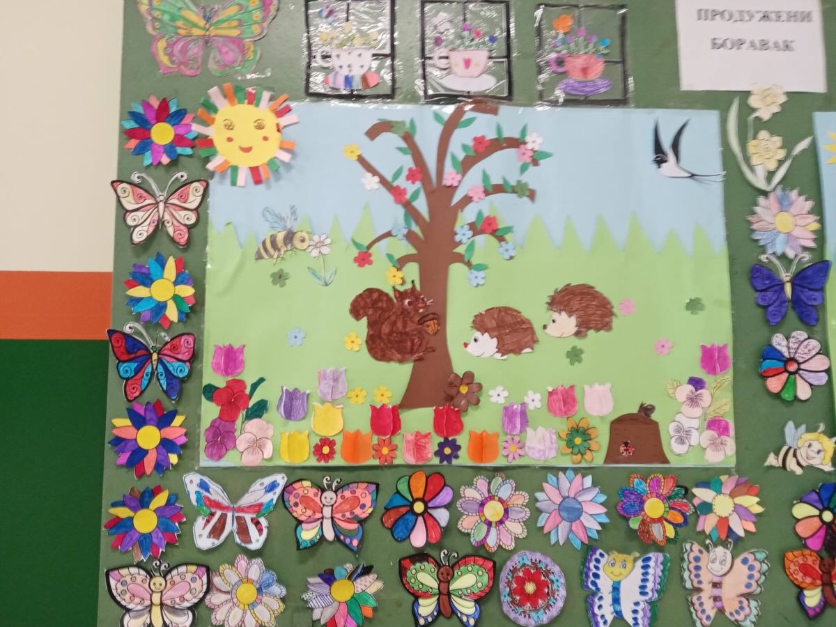 Ученици продуженог боравка, са својим учитељицама, су са уживањем дочекали пролеће. Уз пано пун: зеленила, животиња, птица у лету, цветова разних боја, својим прстићима и маштом, су приказали пролеће.