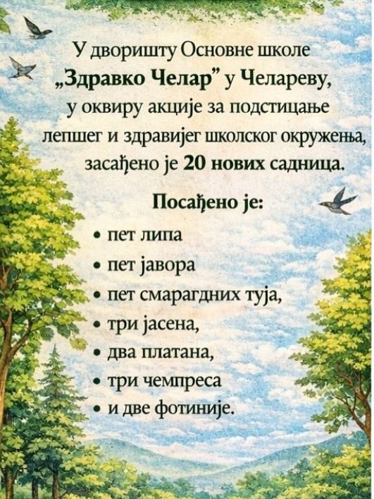 Садња дрвећа има велики значај за очување природе и стварање здравијег и пријатнијег окружења. Дрвеће обогаћује простор, побољшава квалитет ваздуха и доприноси лепшем и функционалнијем школском дворишту, док код ученика развија еколошку свест, бригу и љубав према природи.